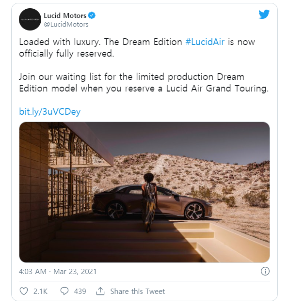 최근 루시드 모터스는 자사의 공식 트위터 계정을 통해 루시드 에어 드림 에디션의 빠른 완판 소식을 알렸다. 다만 구체적인 예약대수는 밝히지 않았으며, 이번에 완판된 루시드 에어 드림 에디션 고객 인도는 올해 하반기부터 시작될 예정이다.