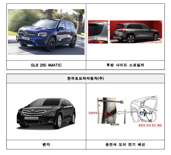토요타자동차의 벤자 V6 등 2개 차종 546대는 운전석 도어 전기 배선이 짧아 장기간 도어 개폐가 반복될 경우 사이드 에어백 센서 전기배선이 배선 커버와 간섭으로 인해 단선되고, 이로 인해 사이드 에어백이 작동되지 않아 사고 발생 시 탑승자를 제대로 보호하지 못할 가능성이 있어 리콜을 실시한다.