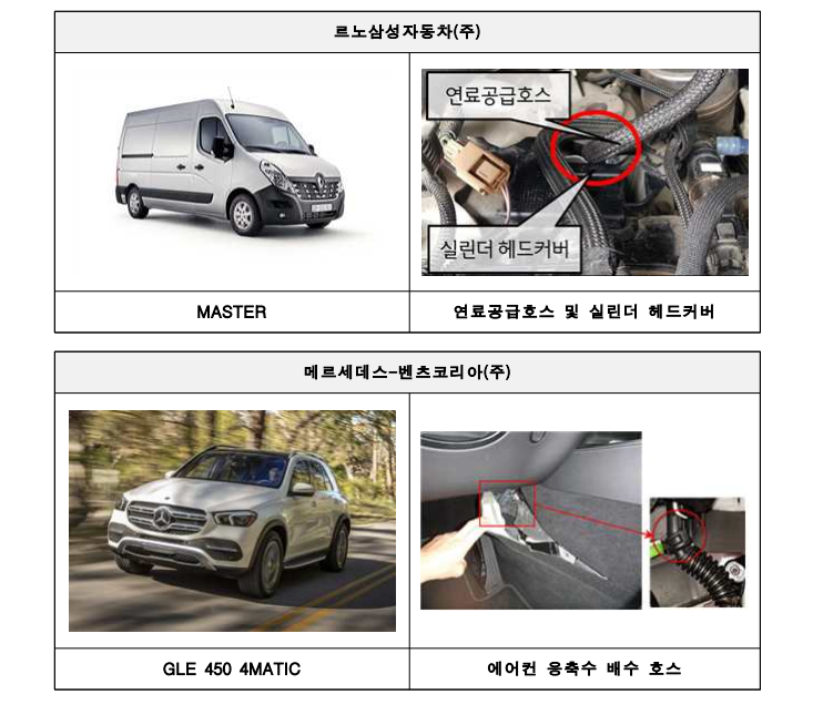 르노삼성자동차의 승합차 마스터도 연료공급호스와 실린더 헤드커버의 간섭으로 호스에 마모나 손상이 발생하고, 연료 누유로 화재가 발생할 가능성이 확인돼 리콜을 실시한다. 리콜 대상 차량은 2,065대다.