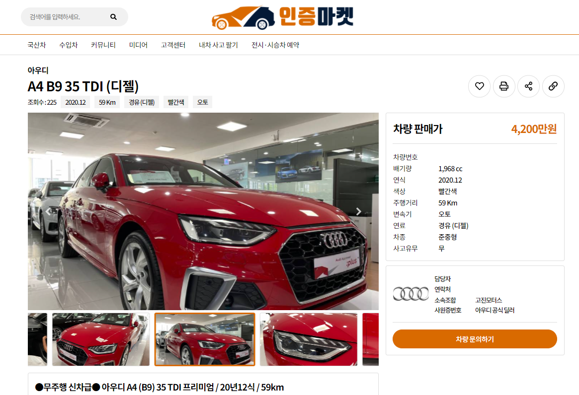 79km의 주행거리를 가진 아우디 A4 35 TDI(2020년 12월식, 신차가격 5,131만원)는 신차대비 931만원 저렴한 4,200만원에 올라와 있다.