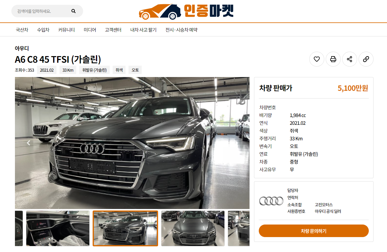 주행거리가 33Km밖에 되지 않은 아우디 A6 45 TFSI(2021년 2월식, 신차가격 6,457만원)는 신차대비 1,357만원 낮은 5,100만원에 올라왔다. 이처럼 주행거리가 100km 미만으로 극히 짧은 차량들은 무주행 신차로 불리는데, 출고 대기 없이 신차급 차량을 즉시 인도받고 싶은 고객들을 중심으로 인기를 끌고 있다.