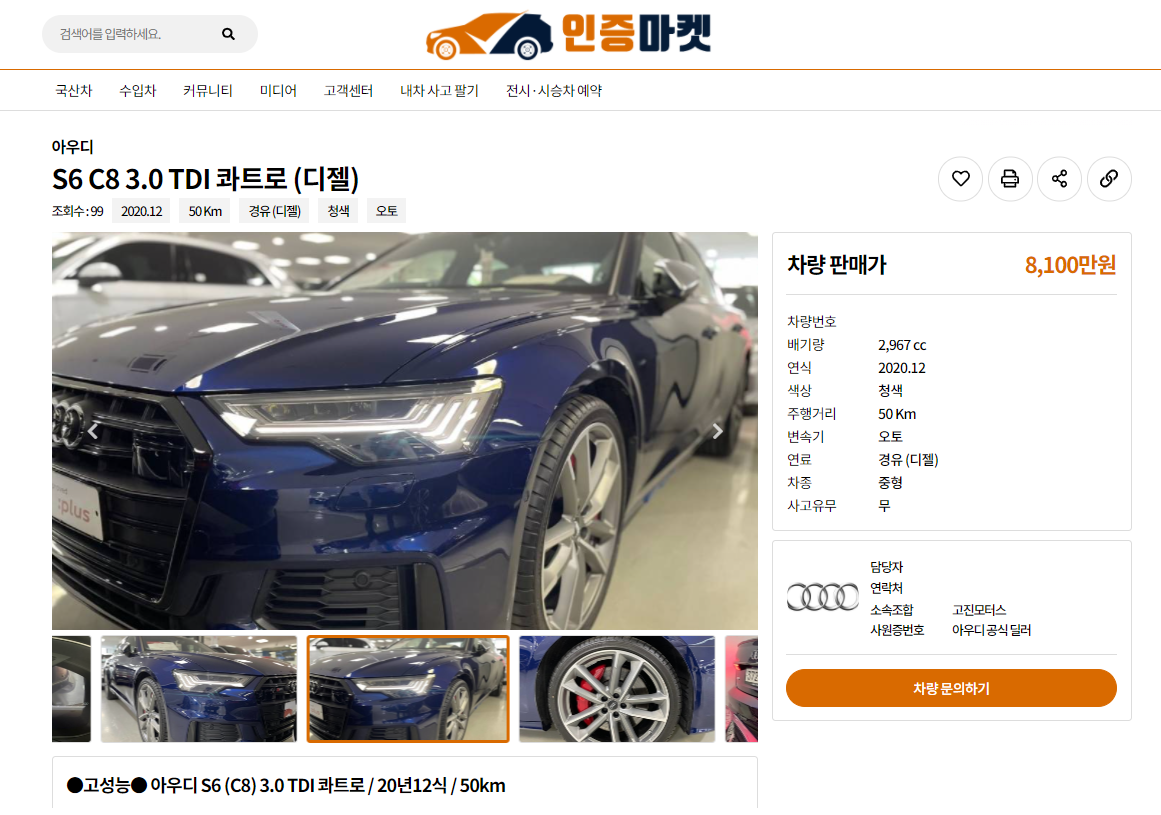 또 고성능 모델들도 신차가 대비 합리적인 가격에 올라와 눈길을 끈다. 76km의 S6 3.0 TDI 콰트로(2020년 12월, 신차가격 1억746만원)도 신차대비 2,646만원 저렴한 8,100만원에 판매되고 있다.