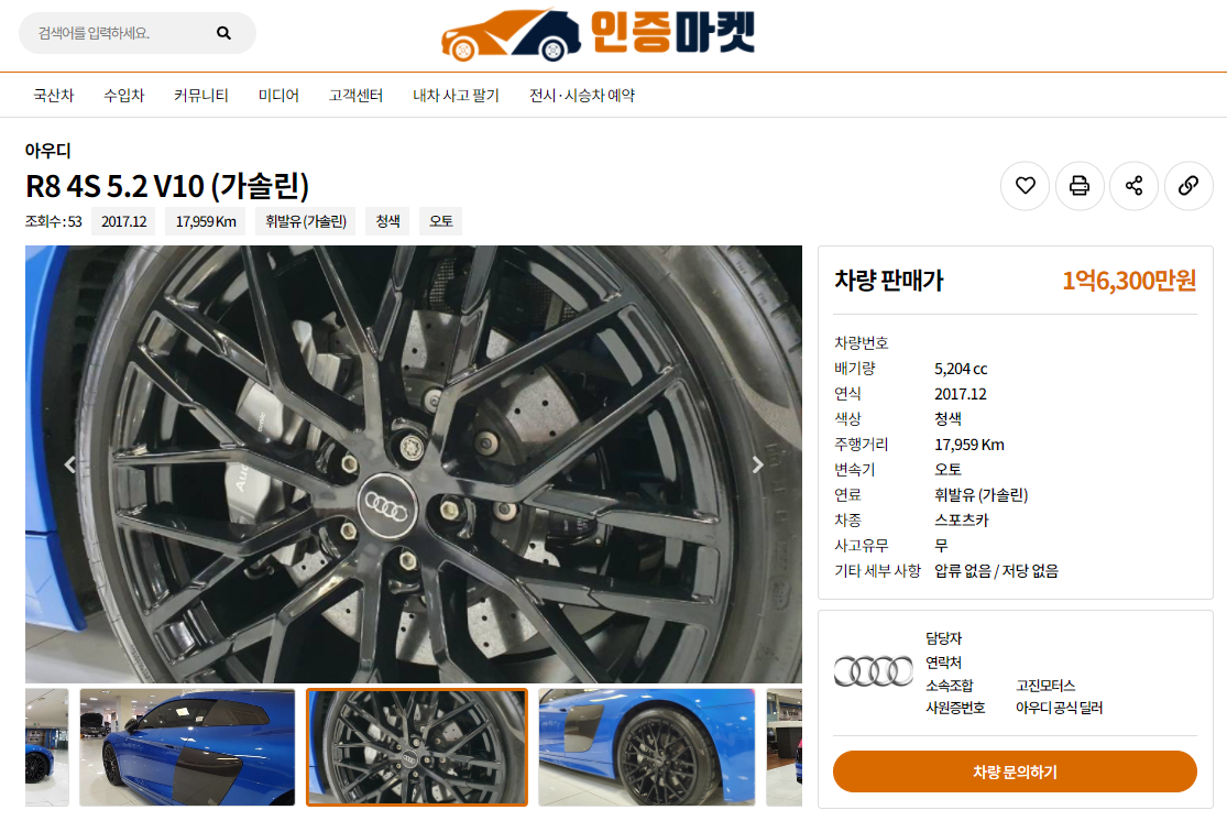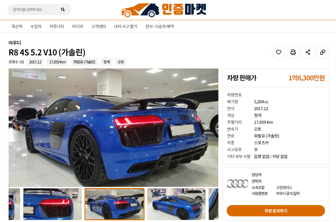인증마켓에 아우디 인증중고차로 등록됐던 아우디 R8 V10 플러스 쿠페(2017년 12월식, 1만7,959km)는 신차 가격이 2억4,900만원에 달했으며, 감가된 판매가격은 1억 6,300만원에 올라왔다.