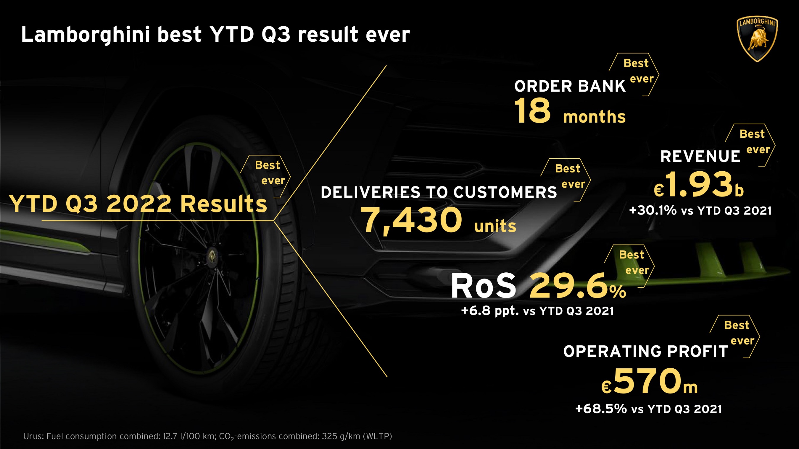 또한 람보르기니 CFO 파올로 포마는 "거시경제 변수들로 인해 현재 전 세계의 불안정함이 지속되고 있는 한편, 람보르기니는 모든 주요 사업과 재무 지표의 성장을 통해 회복력을 보여주고 있다. 우리는 그 어느 때보다 더 나은 회계연도를 마감할 것으로 기대하고 있다"라고 전했다.