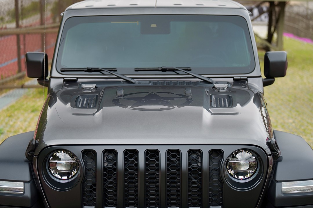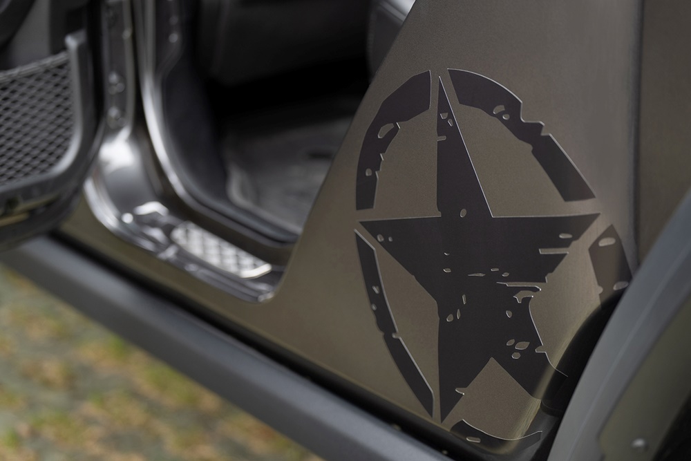 아미 스타 패키지는 후드와 양 도어 사이드 바디에 지프의 전통과 역사를 상징하는 별 모양이 거친 질감으로 표현된 데칼로 시선을 사로잡는다. 여기에 지프의 순정 액세서리인 무광의 새틴 블랙 그릴(Satin Black)을 적용해 한층 강인하면서도 터프한 외관을 완성했다.