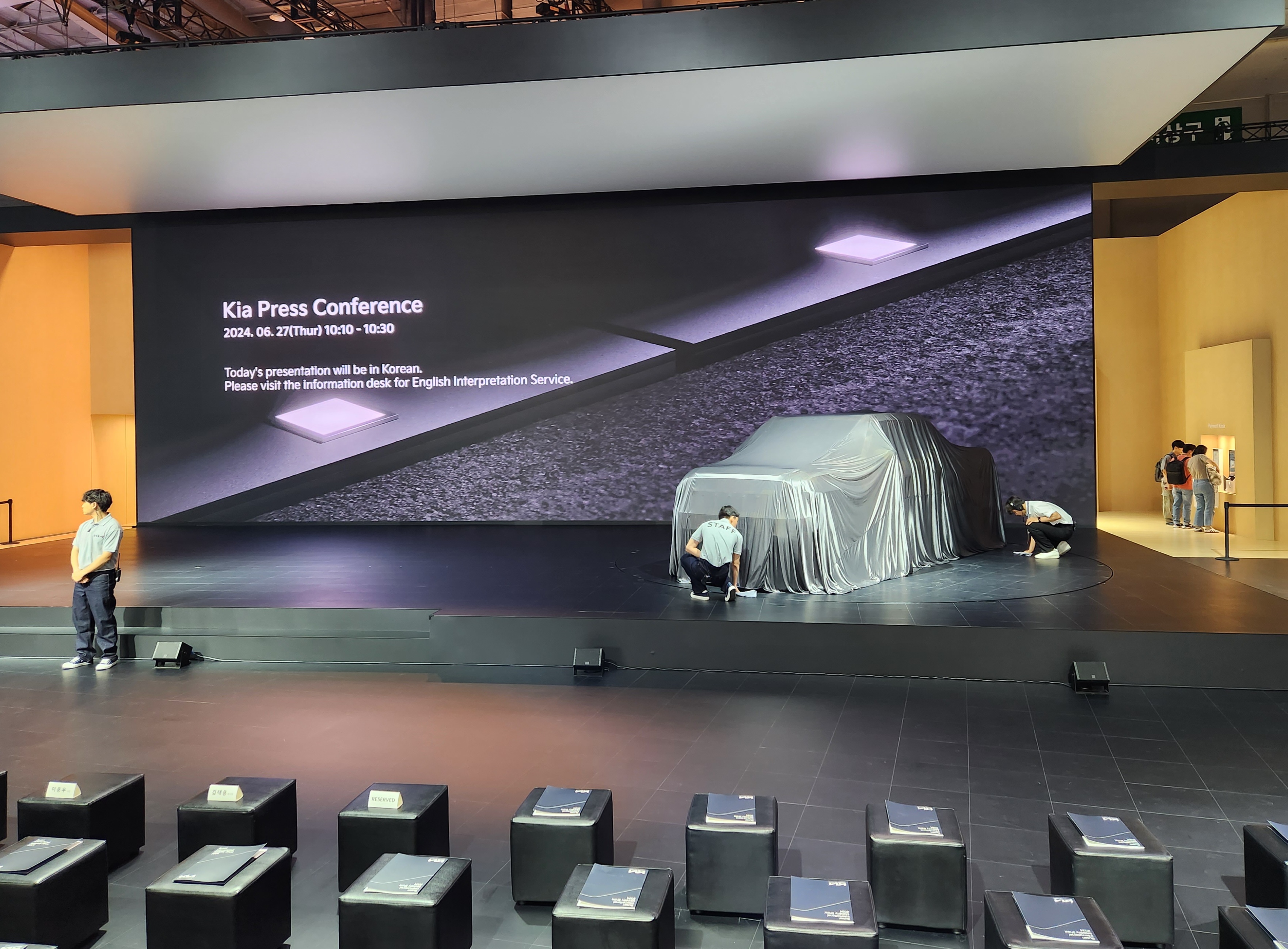 전시관 중앙에 자리한 '더 기아 타스만' 히어로 스테이지는 군더더기 없이 정제된 형태의 무대 디자인을 통해 타스만에 대한 몰입도를 높이고 대형 LED를 배경으로 관람객들이 자유롭고 안전하게 차를 둘러보도록 했다.