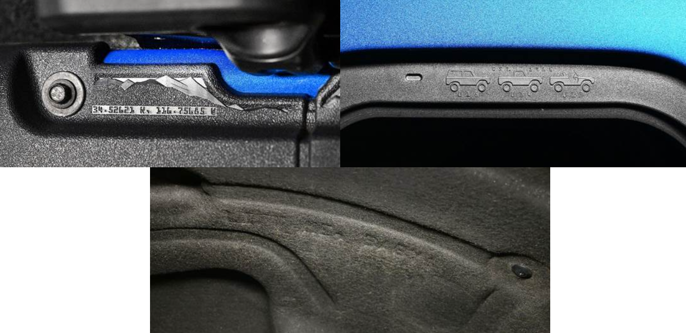 특별한 의미를 담고 있는 이스터 에그들도 있다. 브롱코 조수석 차문 상단에 위치한 산 모양의 각인에는 특정 지역의 좌표가 새겨져 있는데, 이를 검색하면 캘리포니아 주 ‘존슨 밸리(Johnson Valley)’ 지역의 ‘브롱코 언덕(Bronco Knoll)’이라는 지명을 확인할 수 있다.