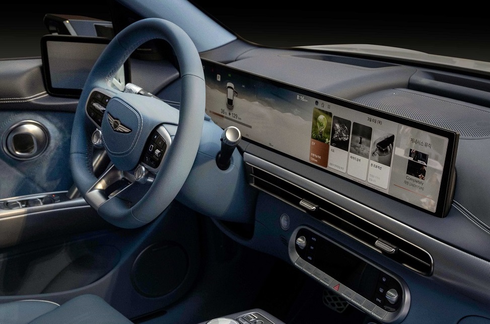 제네시스는 GV60에 클러스터와 AVN 화면 사이의 베젤을 없앤 ‘27인치 통합형 와이드 디스플레이’를 적용해 고급스럽고 하이테크한 분위기를 조성했다. 또한 인체공학적 디자인의 ‘3-스포크 신규 스티어링 휠’을 적용해 스포티한 이미지는 물론, 탁월한 그립감까지 확보했으며, 센터 콘솔과 크래시패드에 신규 패턴의 알루미늄 내장재를 적용해 모던한 감성을 더했다.