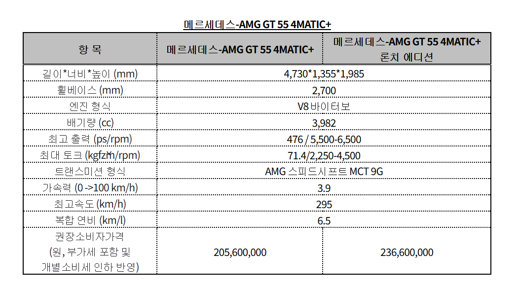 더 뉴 메르세데스-AMG GT 55 4매틱의 국내 가격은 'AMG GT 55 4매틱+' 2억 560만원, 'AMG GT 55 4매틱+ 론치 에디션' 2억 3,660만원이다.