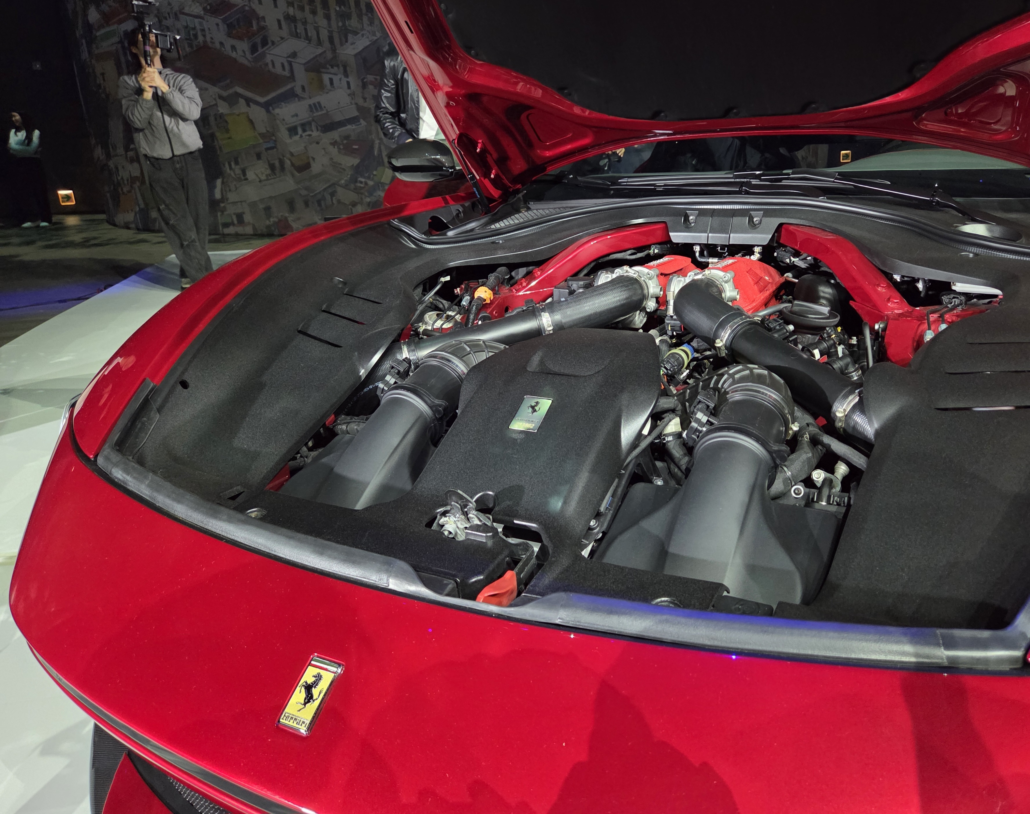 실내에는 듀얼 콕핏 레이아웃이 적용, 신형 스티어링 휠에는 물리 버튼과 함께 페라리의 상징적인 시동 버튼이 다시 도입돼 눈길을 끈다.