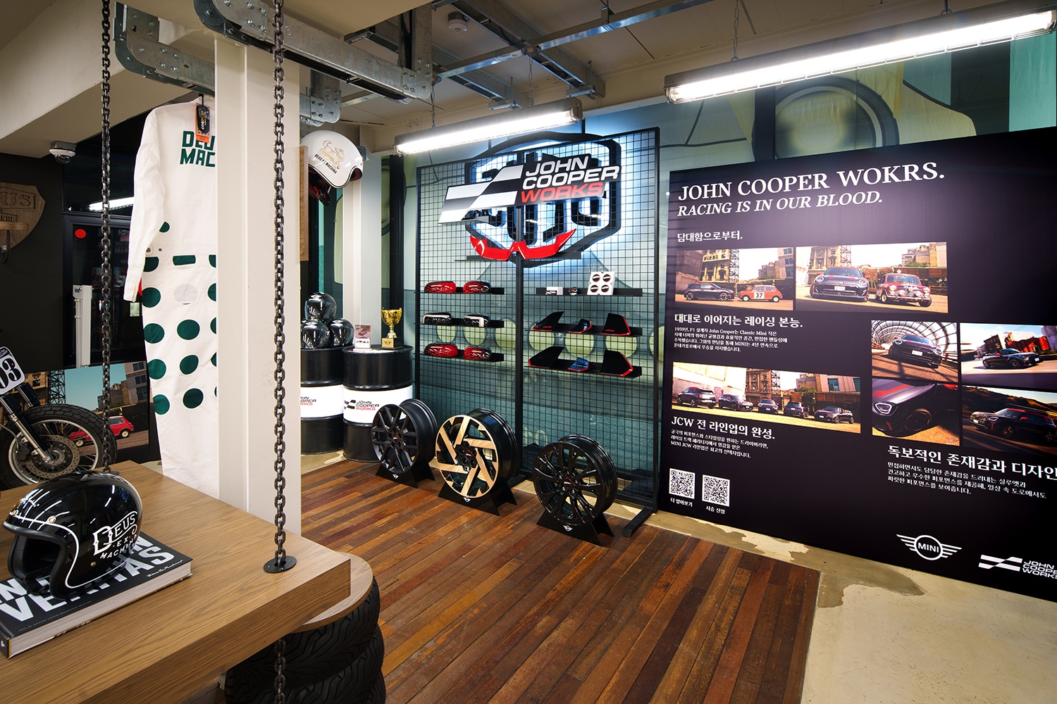 미니와 데우스 엑스 마키나가 협업한 캡슐 컬렉션도 선보였다. 시대를 초월한 스타일링과 디테일에 대한 애착 등 두 브랜드가 공유하는 DNA에서 영감을 얻어 디자인한 의류도 만날 수 있었다. 더불어 존 쿠퍼 웍스의 모터스포츠에 대한 깊은 노하우가 돋보이는 JCW 파츠도 함께 전시돼 방문객들의 호기심을 자극했다.