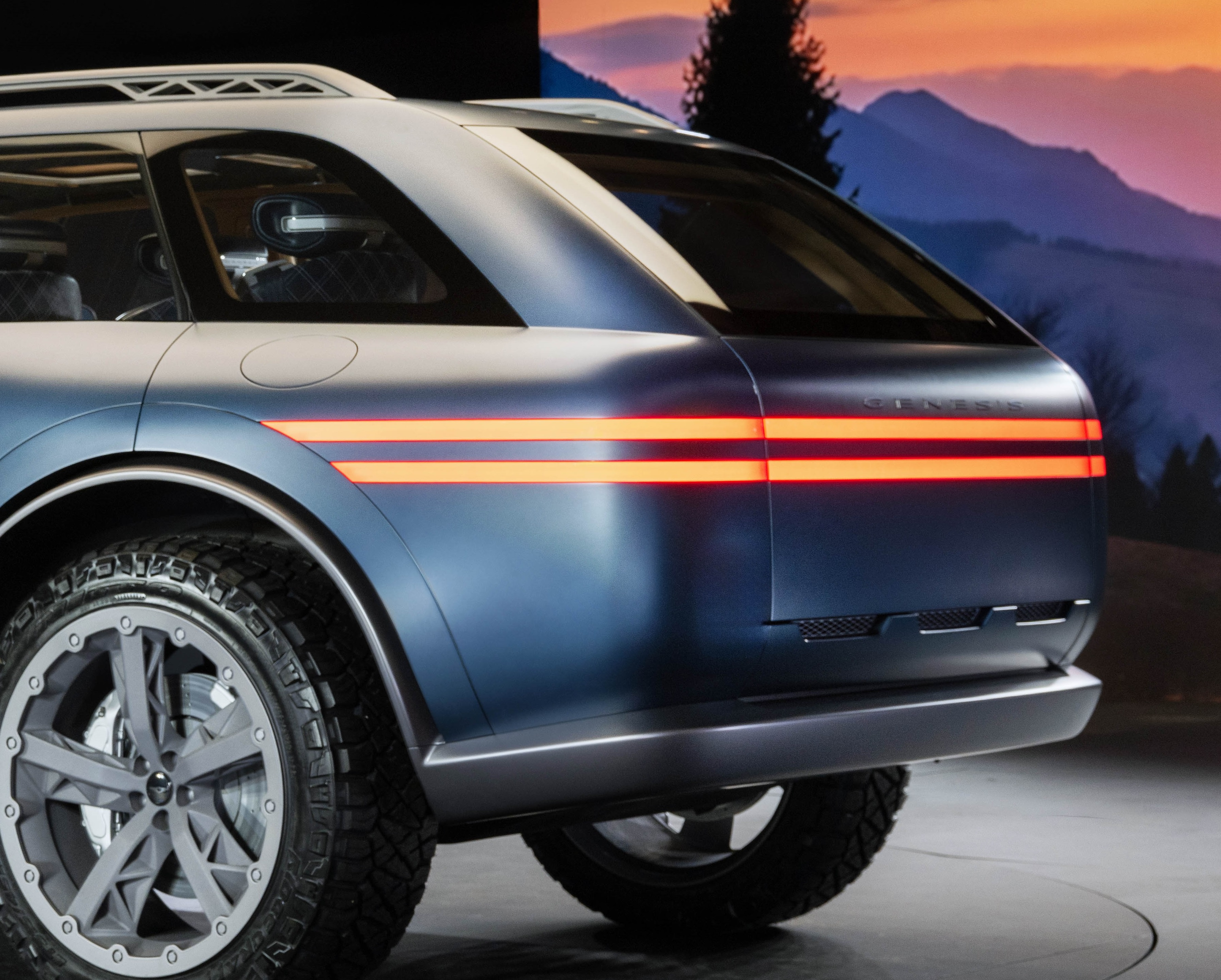 특히 긴 후드와 세련된 캐빈, 가파른 C-필러는 기존 SUV에서 볼 수 없는 독특한 실루엣을 완성하였으며, 위아래로 나뉘어 열리는 후면부의 분할 개폐식 테일게이트는 제네시스의 시그니처 투라인 헤드램프와 조화를 이루어 실용성과 디자인을 동시에 만족시켰다.